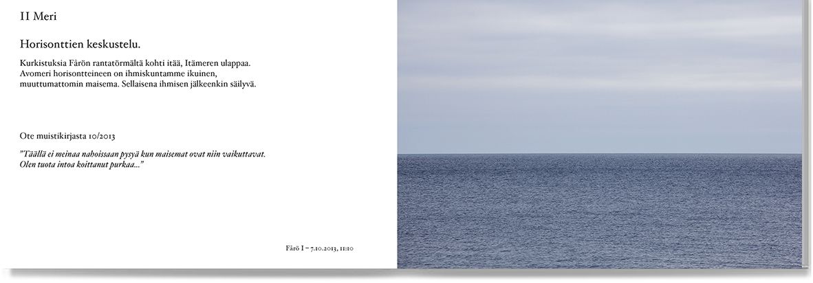 Majapaikka oli meren tuntumassa, rantatöyrään äärellä. Sieltä Tapio Heikkilä kuvasi edessään kohti itää aukeavaa Itämerta kuukauden mittaan eri keleillä, eri valaistuksissa. Toinen luku näyttää miltä merellä näytti.
