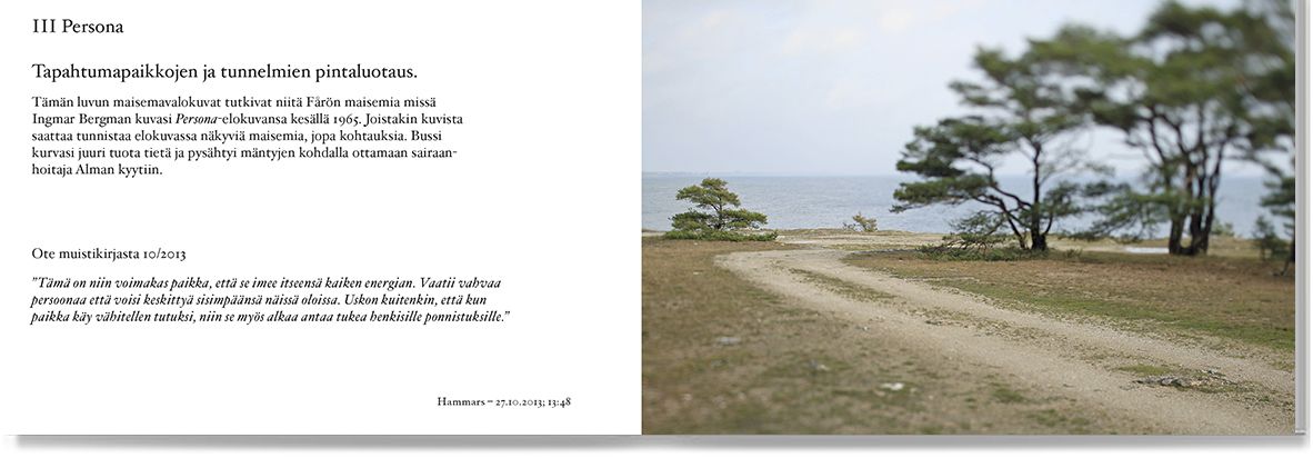 Maan ja meren kuvaamisen lisäksi jäi aikaa vielä muuhun. Heikkilä katsoi Bergmanin elokuvia, joista nousi erityisesti Persona, jonka ohjaaja kuvasi Fårön saarella. Kolmannessa luvussa Tapio Heikkilä jäljittää bergmanilaisia kuvauspaikkoja, niiden merkityksellisiä maisemia.