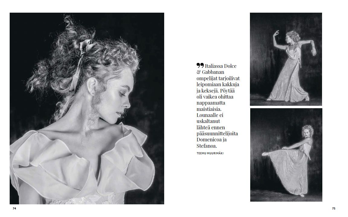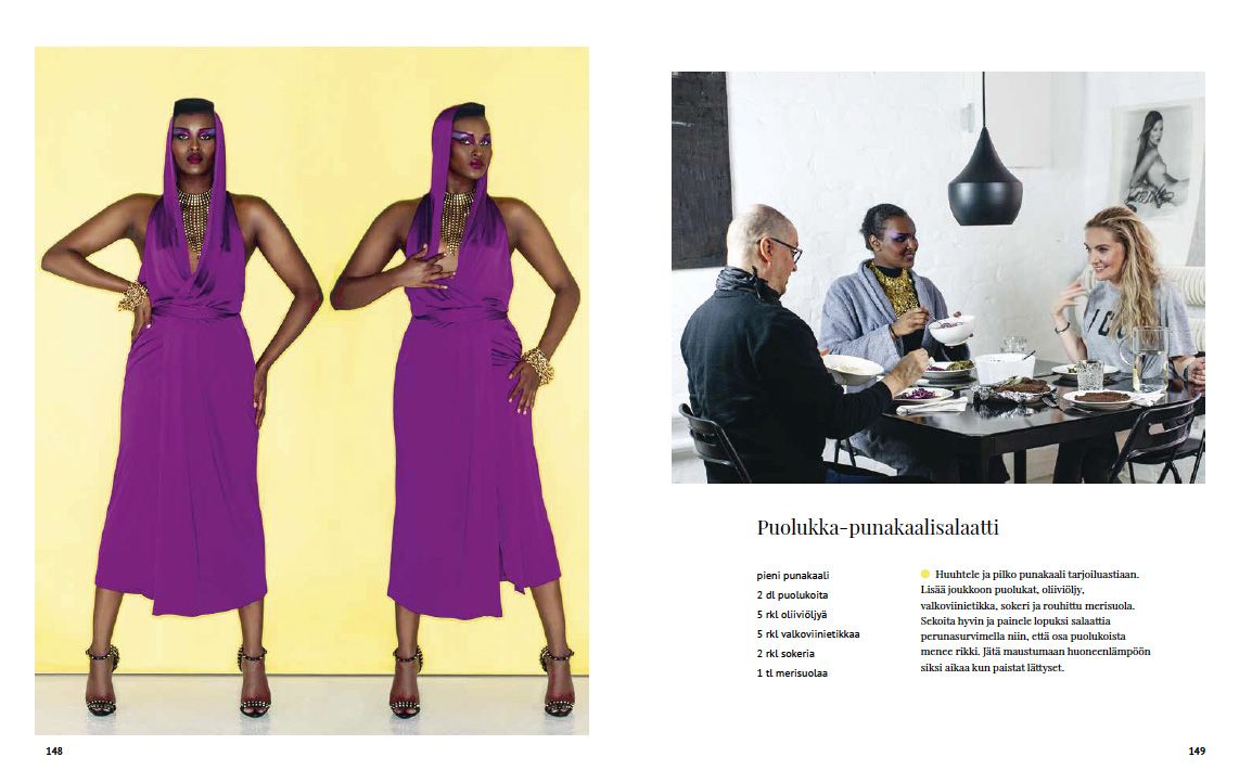 ”Eiväthän mallit syö”, huikataan kameran takaa röhönaurun siivittämänä. Vitsi, jonka kuulin useasti puurtaessani suomalaisen vaateteollisuuden hyväksi. Kommentti ei aidosti naurattanut edes ensimmäisellä kerralla lounasnälän jyrsiessä vatsalaukkuani.” Valokuvaaja Merja Yeung teki 90-luvulla mallintöitä. Kotimaisissa kuvauksissa ei yleensä ollut tapana syödä, kun taas ulkomailla lounas oli itsestäänselvyys. Kameran toiselle puolelle siirryttyään Merja otti opit mukaansa ja kattaa mielellään maittavan lounaan kuvausryhmälle. Fashion Food tarjoaa kurkistuksen sekä muotimaailman glamouriin kuin myös kulissien taakse. Kirjaan on koottu kuvauspäivien herkulliset, yksinkertaiset reseptit kera upeiden muotivalokuvien. Visuaalista elämystä ryydittävät mm. Outi Broux'n, Anne Kukkohovin, Laura Malmivaaran ja Marita Taavitsaisen sekä monen mallimaailman tulevan tähden kertomukset unohtumattomista ruokamuistoistaan.