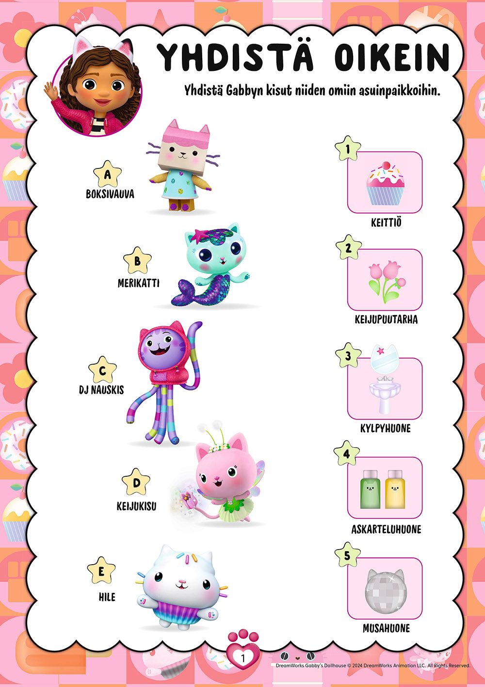 Sinut on kutsuttu miauahtavaan nukketaloseikkailuun! Tule Gabbyn sekä Pandi Pörrön ja muiden kisukavereitten kanssa ratkaisemaan tehtäviä. Mukana myös tarroja!