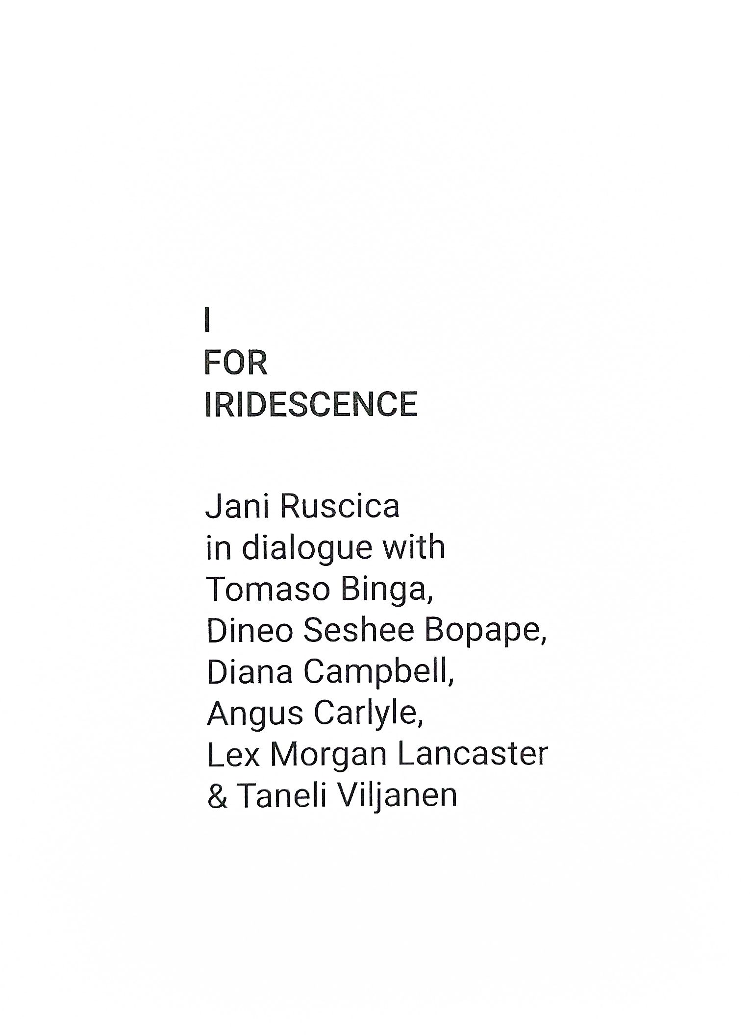 ‘I for Iridescence' is an artist book featuring dialogues Jani Ruscica has had with other artists, writers, curators and scholars. The book functions as a meeting ground, a platform for reciprocal reflections on the practices of all its contributors. Within the last couple of years Ruscica has engaged in conversation with artist Tomaso Binga, artist Dineo Seshee Bopape, curator Diana Campbell, scholar and artist Angus Carlyle, scholar Lex Morgan Lancaster and writer Taneli Viljanen.