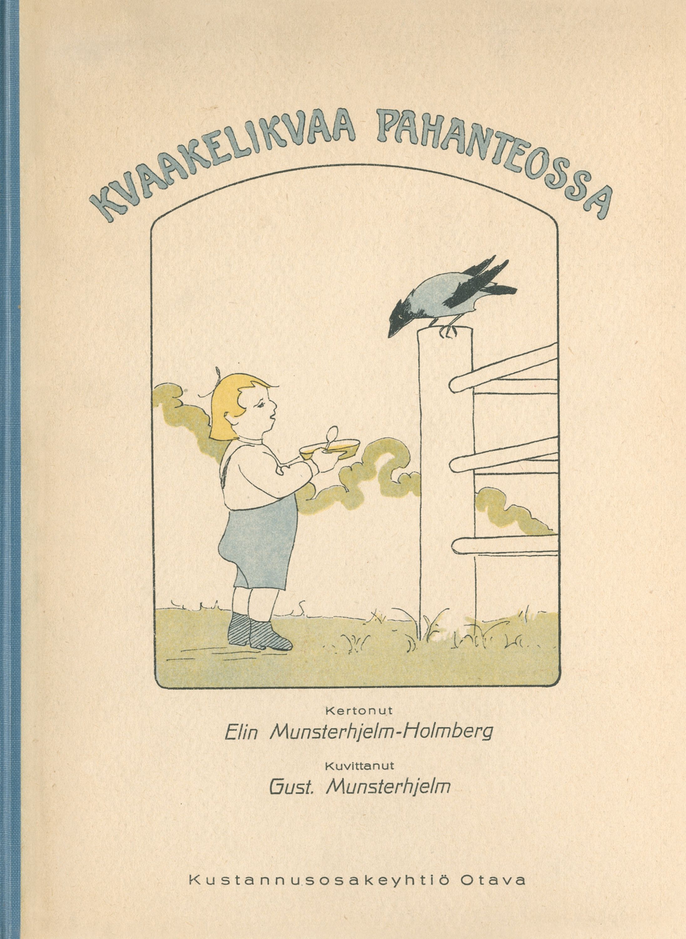 "Sitten Mirrin poistuttua / huomaa ovenrakosen, / kurkistaapi siitä, näkee / hienon ruokahuonehen. // Pöydälle nyt kiiruhtaapi, / tepastaa kuin kotonaan, / kannut kaataa, lasit särkee, / säästy eivät hillotkaan. // Silloin Leena keittiöstä / sisään tulla tupsahtaa, / hävityksen kauhistuksen / kaiken kohta nähdä saa. // Auta armias,kun Leena / riepuansa käyttelee! Ikkunasta avoimesta / lintu parka pakenee." Runokertomus variksenpoika Kvaakelikvaan seikkailuista vuodelta 1923. Kuvittanut Gustav Munsterhjelm.