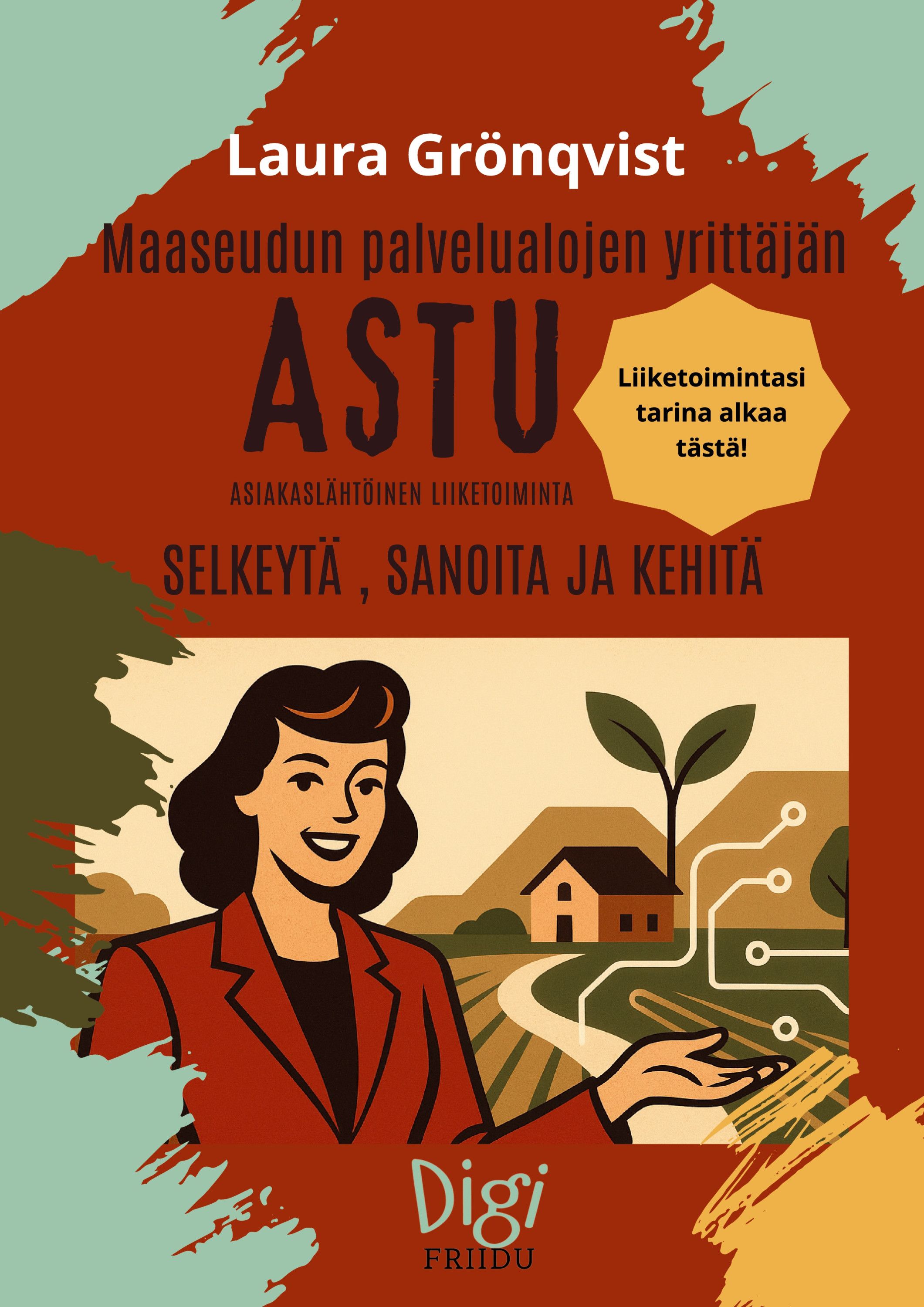 Kirjan ytimessä on AsTu ajattelu Juuret, Versot ja Kukinta. Sen avulla vahvistat ensin oman yrittäjyytesi perustaa. Muotoilet palvelusi selkeiksi ja ostettaviksi kokonaisuuksiksi ja viet ne rohkeasti näkyväksi maailmaan omalla rytmilläsi.