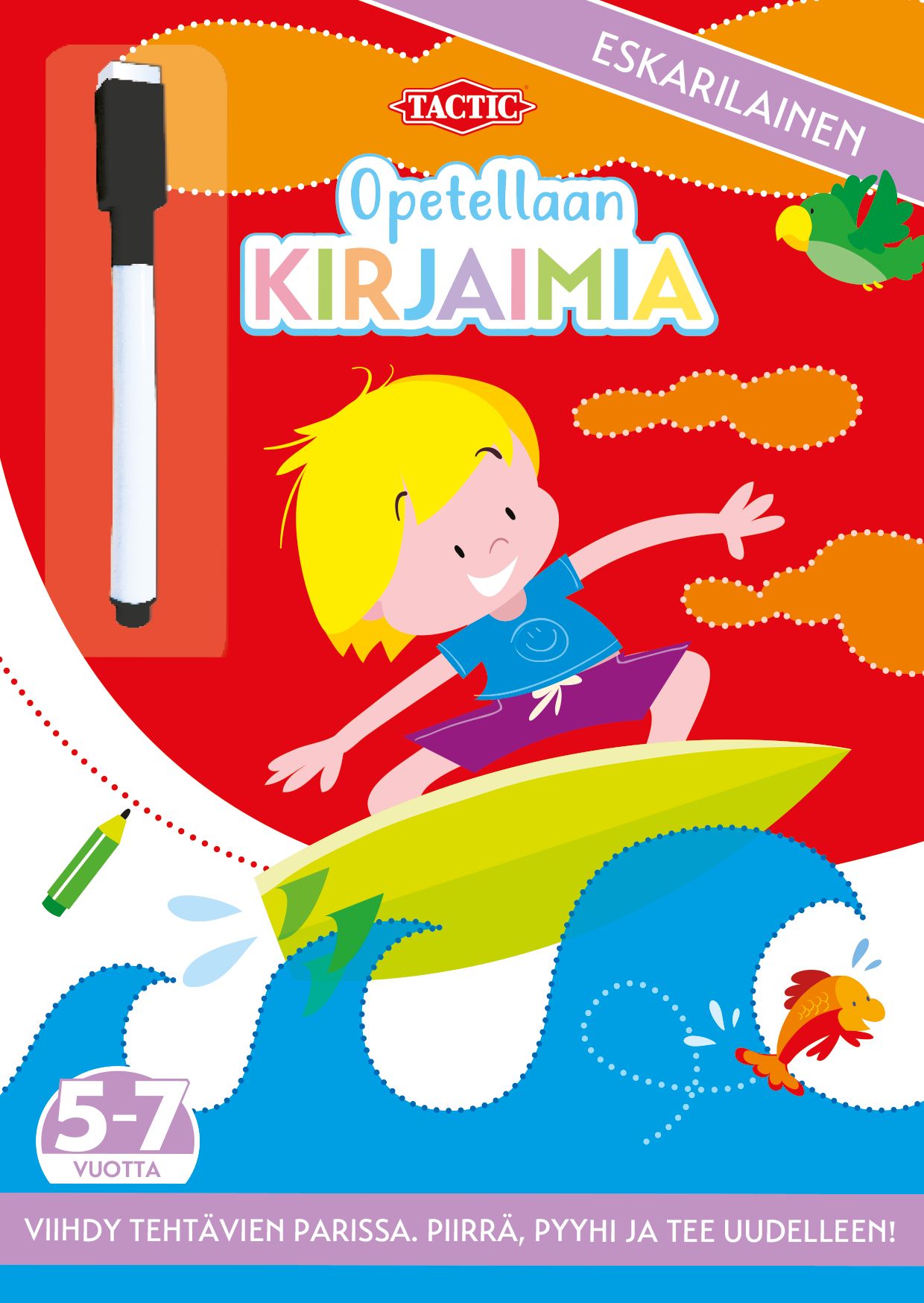 Opetellaan kirjainmuotoja vaiheittain. Löydetään mallia seuraamalla oikeat liikeradat ja edetään kirjainten kirjoittamiseen. Runsas määrä innostavaa tekemistä kehittää kynänkäyttötaitoja leikiten. Mukana pyyhittävä tussi ja pyyhin. Harjoittele uudelleen ja uudelleen!
