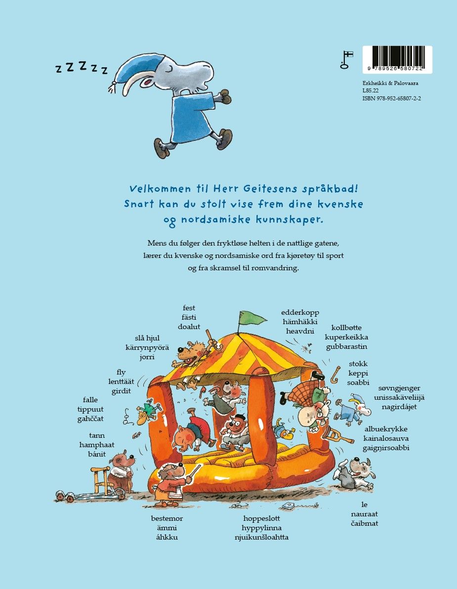 Mens du følger den fryktløse helten i de nattlige gatene, lærer du kvenske og nordsamiske ord fra kjøretøy til sport og fra skramsel til romvandring.